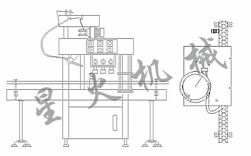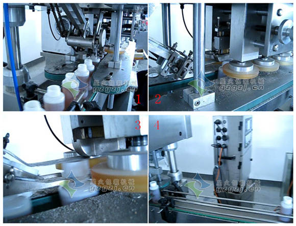1.采用間隙式星盤自動(dòng)定位,螺紋旋蓋。2.圓盤震動(dòng)落蓋,機(jī)械手取蓋,定位準(zhǔn)確無誤。3.瓶蓋由氣缸夾持(可調(diào)夾持力),旋蓋時(shí)無損傷。4.鎖蓋可調(diào)整扭力,以適應(yīng)不同瓶蓋的松緊。 鎖蓋頭部有緩沖裝置,進(jìn)一步降低損壞率。5.可按不同的容器和瓶蓋,更換鎖蓋頭部件及星盤,更換操作簡(jiǎn)便。