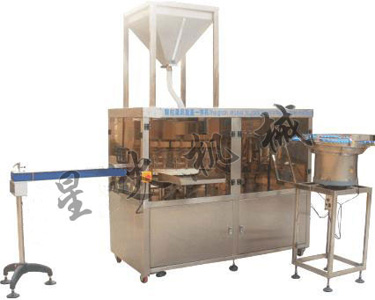 是將灌裝和旋蓋集為一體的自動生產線,本灌裝機一般適用于灌裝顆粒形狀的糖果,藥品,和一些化學物品,只要是顆粒狀態都可用本臺灌裝機進行灌裝。本機操作簡便, 生產能力穩定性高,節省人工,并且安全衛生。 主要參數: 生產能力: 每分鐘150/瓶 主電機功率: 3KW 輔助電機功率: 25W 外形尺寸: 3.1×2.2×2.3m 重 量: 約680㎏ 灌裝顆粒范圍: ф5㎜ —ф6㎜ 主電機工作電壓: 3相 380V50Hz+10% 輔助電機工作電壓:單相 220V50Hz+10%